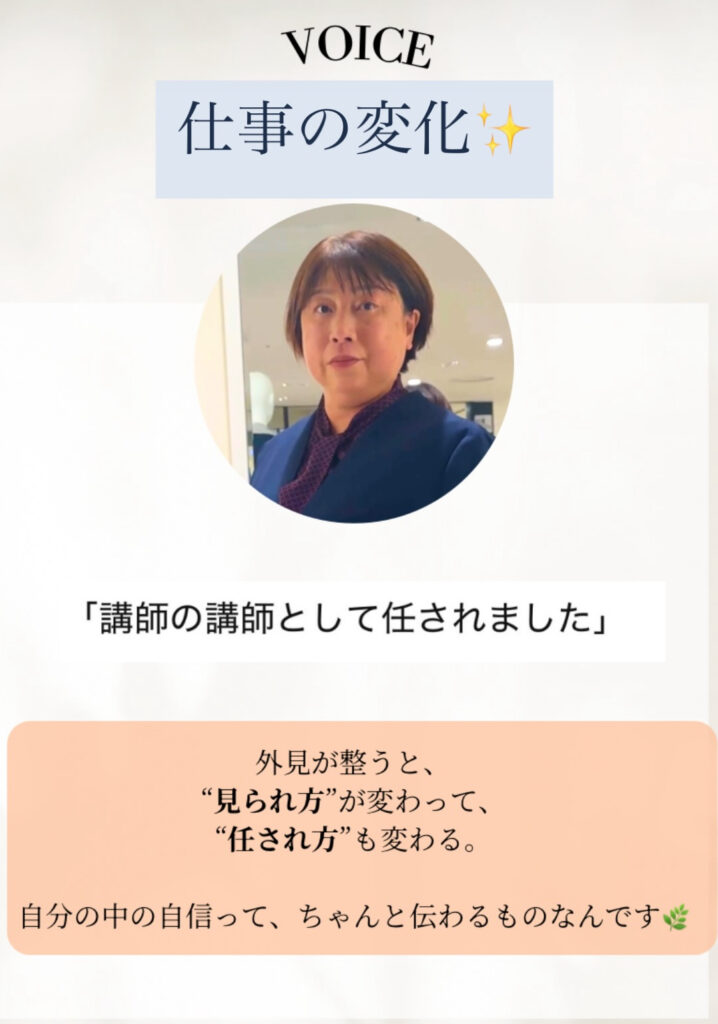 おしゃれに全く興味がない。でも講師としてやっていくにあたって一度ちゃんとしたスタイルをしてみたいという思いで年間契約してくださいました。